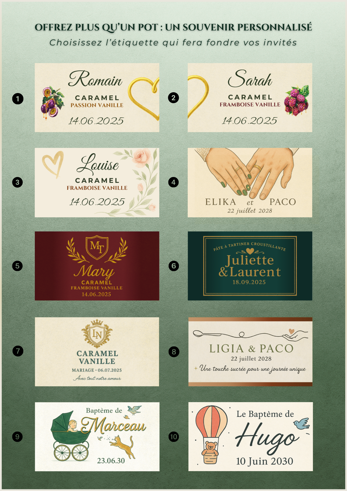 Personnalisez l’étiquette (prénom, date, thème, couleurs) et choisissez votre parfum parmi nos recettes signature :