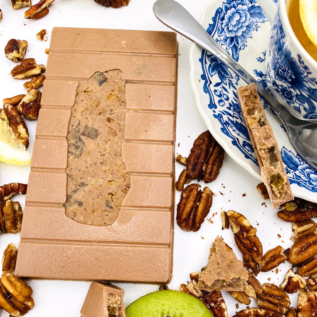 Aber das ist noch nicht alles! Splitter gerösteter Pekannüsse sorgen für eine knusprige Textur und einen dezent holzigen Geschmack, der einen köstlichen Kontrast zur Säure der Frucht bildet. Um das Ganze abzurunden, verfeinert ein Hauch Milchschokolade diese Kreation und sorgt für eine cremige Note, die das Ganze perfekt ausbalanciert.