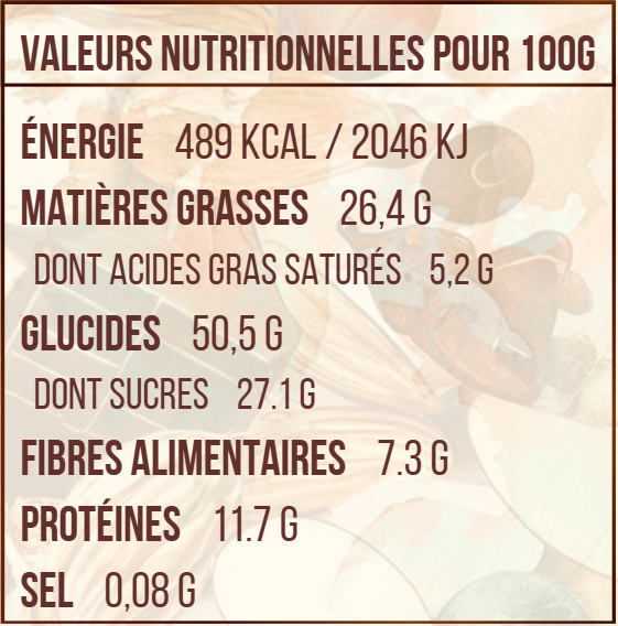 Flocons d'avoine, sucre, noisettes, amandes, flocons de sarrasin, muscovado, noix de pécan, graines de lin, 3,4 % chocolat blanc 29 % (sucre, beurre de cacao, souchet, coco déshydratée, féverole, lécithine de tournesol, vanille, lucuma), 3,4 % chocolat au lait 35 % (sucre, beurre de cacao, souchet, pâte de cacao, coco déshydratée, féverole, lécithine de tournesol, vanille), 3,4 % chocolat noir 60 % (pâte de cacao, sucre, beurre de cacao, lécithine de tournesol, vanille), riz soufflé, cacao en poudre, sel de Guérande.